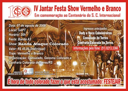 O consulado e a confraria colorada de Torres-RS promoverá uma grande festa no próximo dia 7 de agosto. O IV Jantar Vermelho e Branco será realizado no clube SAPT, às 20h. O jantar será acompanhado de baile com a banda A3 e um grande show com a banda Ataque Colorado. Os ingressos são limitados e já estão à venda na cidade.
