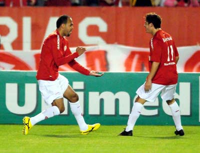 Alecsandro (E) comemora com Giuliano: centroavante abriu o placar no Beira-Rio