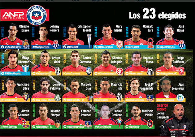 O volante colorado Charles Aránguiz foi confirmado pelo técnico Jorge Sampaoli na seleção chilena que disputará a Copa do Mundo a partir do dia 12 de junho. O Chile está no grupo B do Mundial, ao lado de Holanda, Austrália e Espanha, e estreia dia 13/06, contra os australianos, na Arena Pantanal. Veja a lista completa dos 23 convocados:
