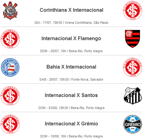Três dias depois, no dia 20, o Inter encara mais um clássico nacional, desta vez contra o Flamengo, no Beira-Rio. Na rodada seguinte, no dia 26, o time de Abel Braga vai até Salvador para enfrentar o Bahia na Fonte Nova. Na sequência, recebe Santos e Grêmio no Gigante.