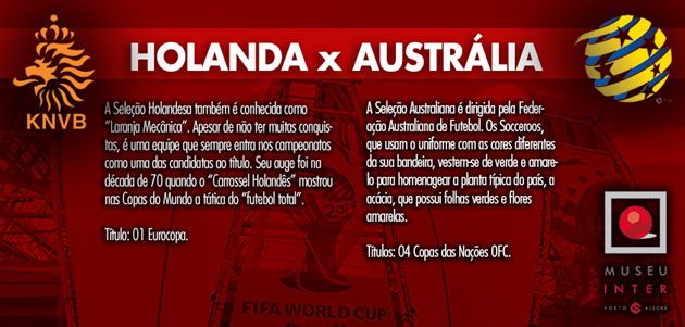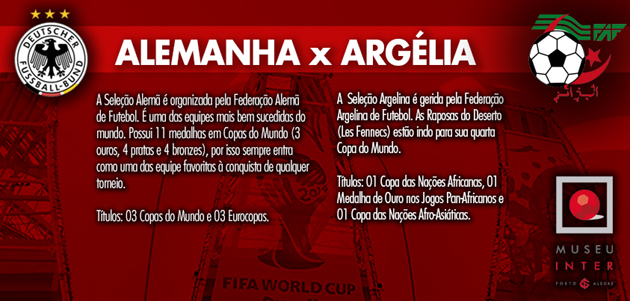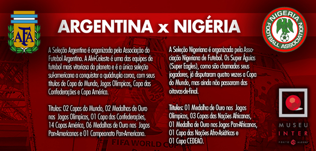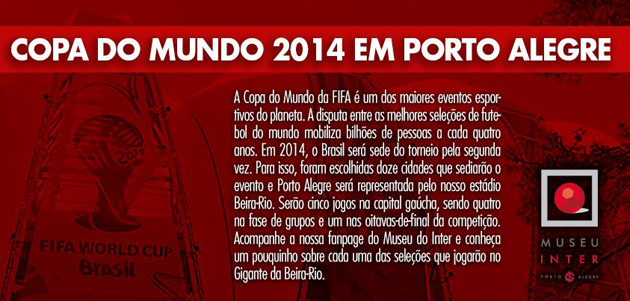 Em homenagem à Copa do Mundo e aos jogos que estão sendo disputados no Beira-Rio, o Museu do Inter preparou uma série de imagens com informações sobre as seleções que vêm a Porto Alegre. O material pode ser conferido na página oficial do Museu no Facebook (https://www.facebook.com/museudointeroficial). Curta e compartilhe com os amigos!