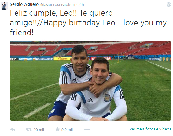 No Brasil, 24 de junho é dia de São João. Mas em tempos de Copa do Mundo, a mesma data ganha outro destaque. O craque argentino Lionel Messi está completando 27 anos nesta terça-feira, véspera do duelo da sua seleção contra a Nigéria, no Beira-Rio, pela última rodada do Grupo F. Depois do tradicional treino de reconhecimento no palco do jogo, o camisa 10 recebeu os cumprimentos dos companheiros Agüero e Mascherano e posou para fotos tendo a casa dos colorados como cenário. As imagens foram parar no Twitter dos jogadores. Confira!