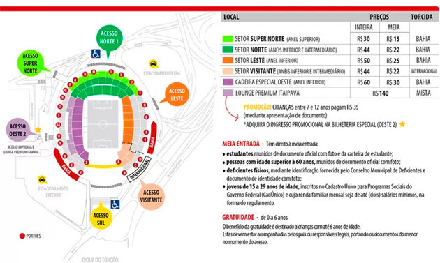 Os torcedores do Internacional terão acesso ao anel inferior da Arena Fonte Nova na partida contra o Bahia, neste sábado, às 21h, pela 12ª rodada do Brasileirão. O ingresso custa R$ 44,00 (inteira) e R$ 22,00 (meia) e pode ser comprado na bilheteria destinada aos visitantes, que funciona a partir das 8h neste sábado.