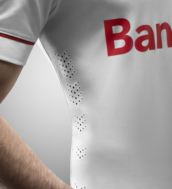 As áreas de ventilação cortadas a laser e os painéis de malha, localizados em partes estratégicas do uniforme, também ajudam a melhorar o desempenho, aumentando a circulação de ar no corpo e regulando a temperatura ao longo dos 90 minutos em campo.