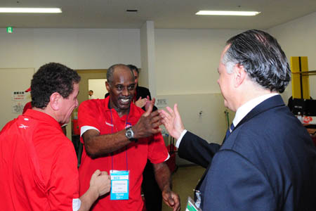 Roupeiro Gentil Passos recebe o cumprimento do vice-presidente de futebol Fernando Carvalho