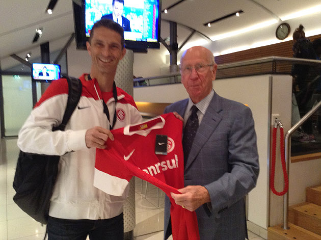 Sir Bobby Charlton recebe de Ortiz (E) a camisa do Internacional