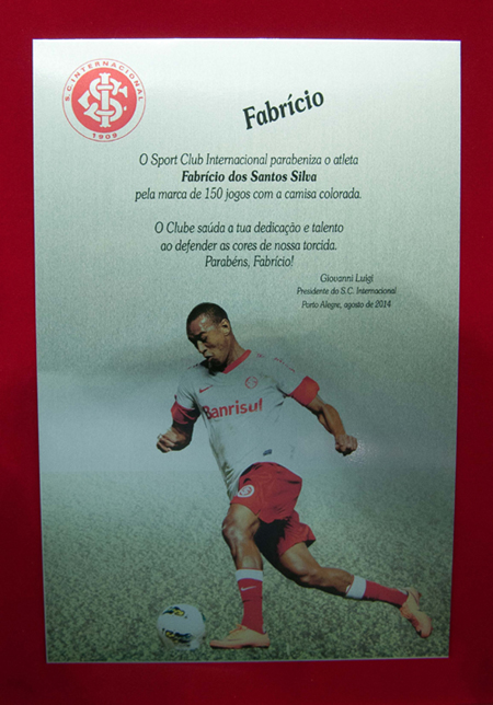 O lateral-esquerdo foi homenageado pelo Internacional antes da partida contra o São Paulo, na noite desta quarta-feira, no Beira-Rio. O camisa 6 foi presenteado com um placa entregue pelo diretor de futebol Roberto Melo alusiva aos 150 jogos completados pelo atleta no duelo contra o Goiás, no último final de semana. Desde 2011 no Clube do Povo, Fabrício soma 13 gols e tem os títulos da Recopa (2011) e do Gauchão (2012, 2013 e 2104) no currículo.
