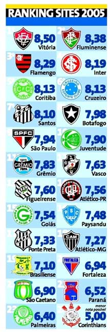 O site oficial do Inter (http://www.internacional.com.br/) é o melhor da Região Sul e o quarto melhor do Brasil, segundo pesquisa realizada pela EsporteBizz - negócios do esporte - publicada no site Lancenet e no jornal Lance! do último dia 20 de setembro. Especialistas em web visitaram as páginas dos clubes da Série A, mais Vitória e Grêmio, e deram notas para os quesitos conteúdo, capacidade de venda, design e navegabilidade. O portal colorado recebeu a nota 8,19 e subiu da 10ª para a quarta posição em relação à última temporada. Veja o ranking completo abaixo: