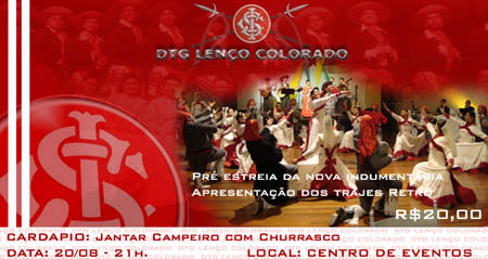 O DTG Lenço Colorado promoverá um churrasco com comida campeira nesta quinta-feira, às 21h, no Centro de Eventos do Beira-Rio. Na oportunidade, será feito o pré-lançamento da indumentária/2009, quando também será apresentado um vídeo com todos os trajes utilizados pelo DTG nos últimos sete anos. Os ingressos estão à venda na loja Coza Gaúcha. Mais inforações sobre o grupo tradicionalista oficial do Inter no site http://www.dtglencocolorado.com.br/.