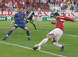Aos 24min, a zaga recuou mal para o goleiro Lauro que dividiu a bola com Fernandão. Na sobra, Tinga, da intermediária, chutou de primeira na tentativa de marcar o gol por cobertura, mas a bola subiu demais. Aos 24min40seg, Wellington tentou cruzar da esquerda e quase marcou um gol direto. Lauro, de boa atuação, salvou para escanteio. Aos 27min, Tinga roubou a bola de Preto e tocou para Sobis em condições de marcar o gol. O juiz Elvécio Zequetto, porém, anulou o lance marcando equivocadamente falta de Tinga.