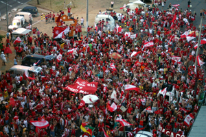 Enquanto o aguardado ônibus não despontava no portão do aeroporto, a massa vermelha e branca cantava o hino do clube e gritos de guerra como 'Campeão da Série A!' e 'Tetracampeão'. Faixas e cartazes lembravam os escândalos da arbitragem que resultaram na injusta anulação dos jogos pelo STDJ. Taças fictícias saltitavam em meio a multidão que, com orgulho, reconhecia a conquista do campeonato pelo Inter.