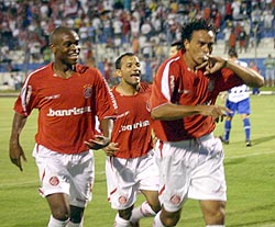 Luiz Adriano (E), Iarley (C) e Ediglê (E) comemoram: Inter goleou por 5 a 1