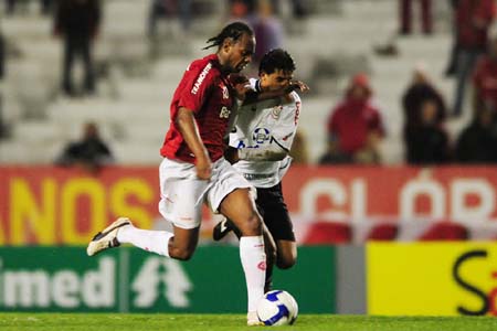 O jogo era franco, com chances para os dois lados. Aos 21min, Jorge Henrique arriscou de fora da área e quase marcou um golaço. A bola passou muito perto. A resposta colorada veio na mesma medida, aos 23min: Marcelo Cordeiro fez bom cruzamento para Alecsandro cabecear no travessão. A partida era lá e cá. Aos 24min, Dentinho arrancou pela direita e chutou forte. A bola passou ao lado do gol com perigo.