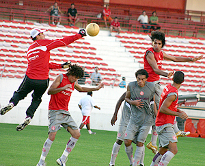 Clemer salta para afastar a bola: Inter treina forte para enfrentar o Pumas