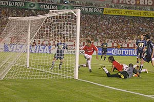Aos 27min10seg, Fernandão recebeu na área e chutou cruzado de pé esquerdo ao lado do gol. Aos 31min15seg, Rubens Cardoso cruzou e Michel cabeceou na trave. Quanto o Inter pressionava e dominava a partida, levou o segundo gol. Aos 34min40seg, Botero cobrou falta rasteiro, a bola passou pela barreira e Clemer não conseguiu defender: 2 a 0.
