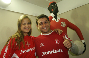 Atriz Luiza Valdetaro (E) junto do judoca campeão mundial e assíduo no Beira-Rio João Derly - ao fundo, o Saci, símbolo colorado