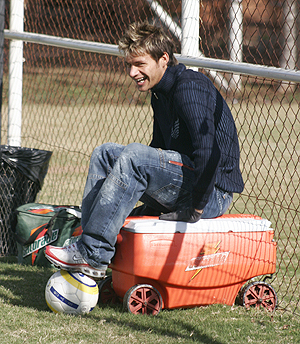 Bem-humorado: Sobis acompanhou o treino à beira do gramado