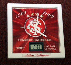 O Sport Club Internacional comunica aos Sócios, Cônsules, Vice-cônsules e Representantes que já está à disposição na vice-presidência de Comunicação Social, no Beira-Rio, o relógio de parede comemorativo ao centenário do clube. O relógio - lançado oficialmente no dia 9 de julho, quando faltavam mil dias para o centenário do Inter - tem o valor de R$ 80 e está sendo vendido exclusivamente no clube. O produto possui um display digital que faz uma contagem regressiva dos dias que faltam para a celebração dos 100 anos do Inter. Infomações ou reserva do produto pelo telefone (51) 3230-4567, com Ana Cristina.