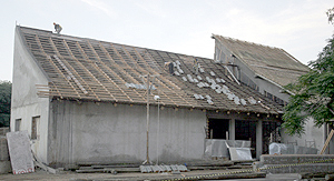 A primeira parte da cobertura já está sendo colocada. O material utilizado é a palha de Santa Fé, que servirá para proteger o Galpão do sol e da chuva, além de auxiliar como isolante térmico e acústico. Logo, o telhado de cerâmica será posto por cima, para reforçar ainda mais a estrutura.