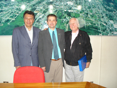 Figueroa (E) e Dallegrave (D) foram presenteados pelo prefeito de Carlos Barbosa Irani Chies (C) com um kit da principal indústria do município