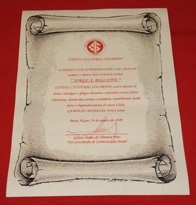 Nomeado como cônsul cultural colorado para representar e divulgar o Inter na Argentina, Jorge Biglione mostrou-se emocionado com a homenagem e, sócio colorado, chegou a cantarolar o hino do Clube durante seu agradecimento. "Me sinto muito honrado com este título de cônsul, seguirei colorado e ajudando o Internacional onde eu estiver", disse Biglione. "Estamos premiando uma amizade sincera do Inter com este gentil senhor, que sempre nos apoiou quando precisamos resolver algum assunto relacionado à Argentina, seja em negociações de jogadores ou mesmo nos jogos naquele país", afirmou o presidente Vitorio Piffero.