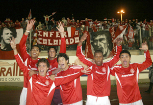 Jogadores vibram com a fiel torcida colorada ao fundo