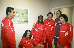 Da esq. para dir.: Renan, Perdigão, Tinga, Ediglê, Clemer e Chiquinho durante a reapresentação no vestiário do Beira-Rio