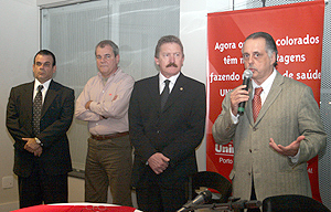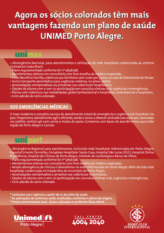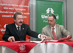 Colorado de carteirinha tem um motivo a mais para cuidar da sua saúde. O Sport Club Internacional, em parceria com a Unimed Porto Alegre, está oferecendo aos 31,5 mil associados do clube planos de saúde com condições especiais. O convênio entre a Unimed e o Internacional foi assinado nesta segunda-feira, nas suítes do Beira-Rio. "É um momento histórico no futebol brasileiro, quando o Inter traz um grande benefício ao qualificado quadro social colorado. Estimamos que esta parceria poderá aumentar em pelo menos 30% o crescente número de sócios e fidelizar cada vez mais aqueles que já estão conosco", comemora o presidente colorado Fernando Carvalho.