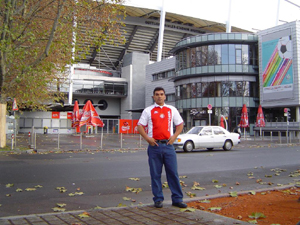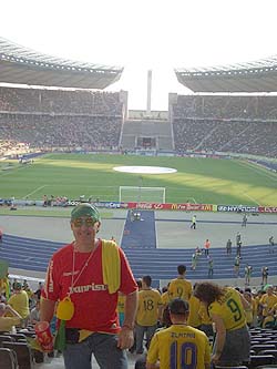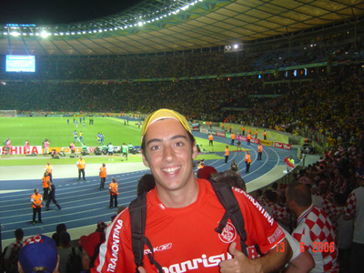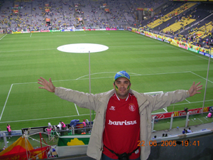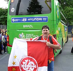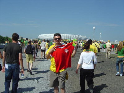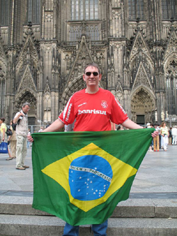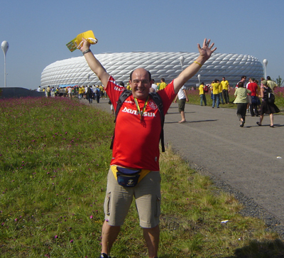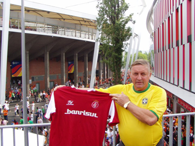 Mathias Bantel, em frente ao estádio de Frankfurt (Brasil x França)