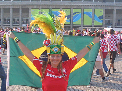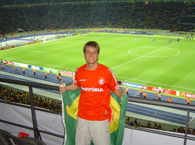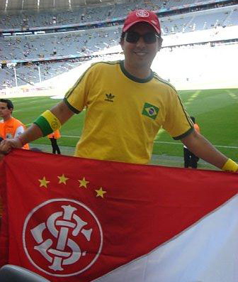 Denis Azevedo (com a bandeira do Inter), em Berlim, momentos antes do jogo Brasil x Croácia