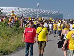 Marcos Grecelle (E) e Matheus Spolidoro em frente à Arena de Munique