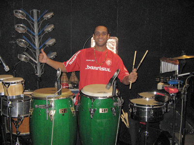 Percussionista André Siqueira veste orgulhoso a camisa usada por Fernandão
