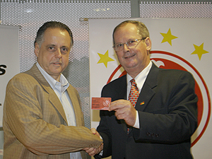 Fernando Carvalho (E) e o diretor-presidente da Procergs, Carlos Alberto Pacheco de Campos, que exibiu a sua carteirinha de sócio colorado