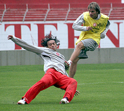 Rafael Sobis (colete amarelo) treina forte no último trabalho realizado em Porto Alegre