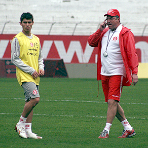 Abel Braga passa instruções no último treino no Beira-Rio antes do confronto no Paraguai. Meia-atacante Alex observa
