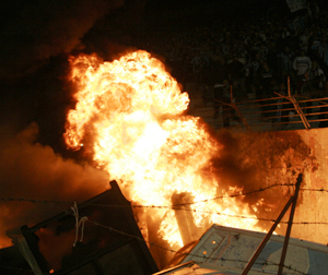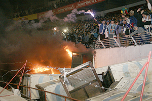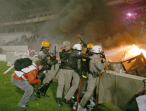 Antes do incêndio, os torcedores gremistas já haviam entrado em conflito com a Brigada Militar, quebrando a grade de separação das torcidas. Não satisfeitos, jogaram pedras e bombas nas policiais. Um ato de barbárie, indigno para uma torcida de futebol.