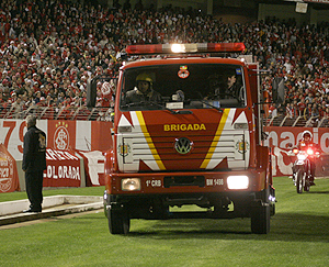 Cena inusitada: caminhão de bombeiros entra no Beira-Rio para controlar o incêndio provocado por torcedores gremistas