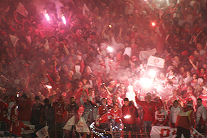 O time colorado entrou em campo sob uma festa espetacular da torcida com canções, gritos, aplausos e fogos de artifício. Os jogadores receberam uma carga de adrenalina ainda maior ao se depararem com as arquibancadas tomadas pelo vermelho de mais de 50 mil torcedores.