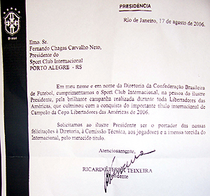 O Sport Club Internacional recebeu uma correspondência da Diretoria da Confederação Brasileira de Futebol (CBF) cumprimentando o clube, na figura do presidente Fernando Carvalho, pela 'brilhante campanha realizada durante toda Libetadores da América, que culminou com a conquista do importante título internacional'. O documento também saudava a Diretoria, a Comissão Técnica, aos jogadores e a imensa torcida do clube pelo merecido título. A carta foi assinada pelo presidente da CBF, Ricardo Teixeira.