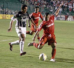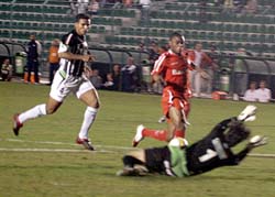 Luiz Adriano tenta superar o goleiro Andrey: atacante foi o substituto de Fernandão, suspenso pelo terceiro cartão amarelo