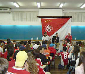 O presidente Fernando Carvalho e o meia-atacante Fernandão participaram na última sexta-feira (29/9) do Projeto Cultural do curso pré-vestibular Unificado. O dirigente e o capitão da conquista da América responderam perguntas e contaram curiosidades aos alunos do cursinho sobre a campanha histórica do Inter na Libertadores.