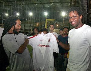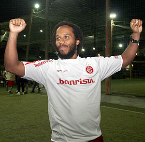 O astro do reggae internacional, Ziggy Marley - filho de Bob Marley, o pai do gênero musical originado na Jamaica -, fez um grande show na noite desta terça-feira (03/10) em Porto Alegre. Porém, assim que chegou à capital gaúcha um dia antes, vindo de apresentação em Buenos Aires, o músico teve o seu desejo de jogar uma partida de futebol no Brasil realizado. O pedido havia sido feito quando ainda estava em Buenos Aires e Lelê Bortholacci, produtor das bandas gaúchas Cachorro Grande e Fresno, se encarregou da organização do jogo. Se não bastasse jogar, Ziggy Marley vestiu na partida a camisa do Inter campeão da América personalizada com seu nome às costas. O presente foi dado pelo zagueiro colorado Wilson, fã de reggae, que também realizou seu sonho de fazer uma foto ao lado do ídolo.