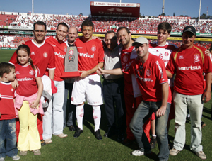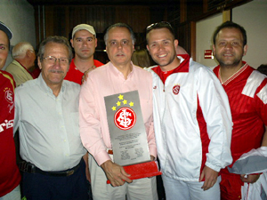 Integrantes do núcleo do Genoma Colorado de Xanxerê (SC) entregaram uma placa comemorativa à conquista da Libertadores para o volante Edinho antes da partida Inter x São Caetano, neste domingo, no Beira-Rio. O vice-presidente de Comunicação Social, Gelson Pires, e o cônsul do clube em Xanxerê, Edson Rosa, também participaram da homenagem.