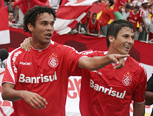 Iarley (C) comemora o primeiro gol: Inter segue na briga pelo título do Brasileirão