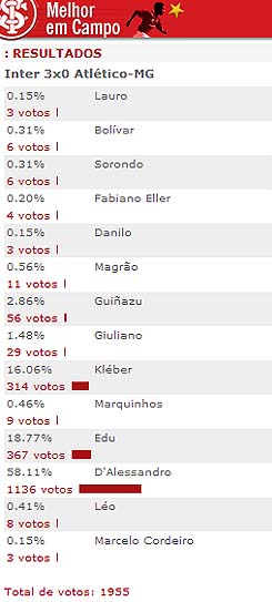 Os internautas escolheram D'Alessandro como o melhor jogador em campo na goleada de 3 a 0 sobre o Atlético-MG. O jogador entrou no segundo tempo e foi decisivo na construção do placar. Fez o passe que originou a jogada do primeiro gol, marcado por Edu, e marcou o segundo, em um preciso chute do interior da área. Veja os números da votação promovida pelo site: