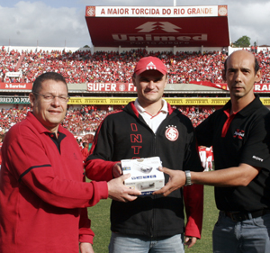 2º vice-presidente do Inter, Mário Sérgio Martins (E), Fabrício Conte (C) e Mauro Fernandes na entrega da câmera da Sony
