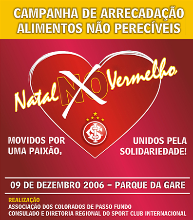 A Associação dos Colorados de Passo Fundo realizará uma grande campanha solidária no próximo dia 9 de dezembro. A intenção é reunir uma multidão de colorados para percorrer as ruas da cidade pedindo doações de alimentos. "Os colorados invadirão as ruas, não para comemorar vitórias e titulos, mas sim para trabalharem voluntariamente nessa campanha", afirma o cônsul e diretor regional, Jaime Bridi.