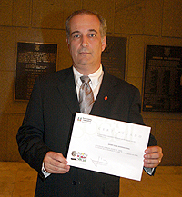 Giovanni Luigi exibe o certificado do Prêmio Responsabilidade Social - Destaque-RS 2006 conferido ao Sport Club Internacional