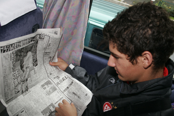 Alexandre Pato lee las noticias del Mundial en el periódico japonés