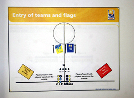 O próximo passo foi tratar de como os times irão entrar em campo, bem como as posições de cada equipe. O Inter irá ficar no lado esquerdo da sua televisão, enquanto o Barcelona no lado direito, quando ambos estiverem perfilados antes da partida. Em seguida, os jogadores do Barcelona vão se dirigir até os do Inter para todos se cumprimentarem um a um. É o mesmo protocolo dos jogos da Copa do Mundo.